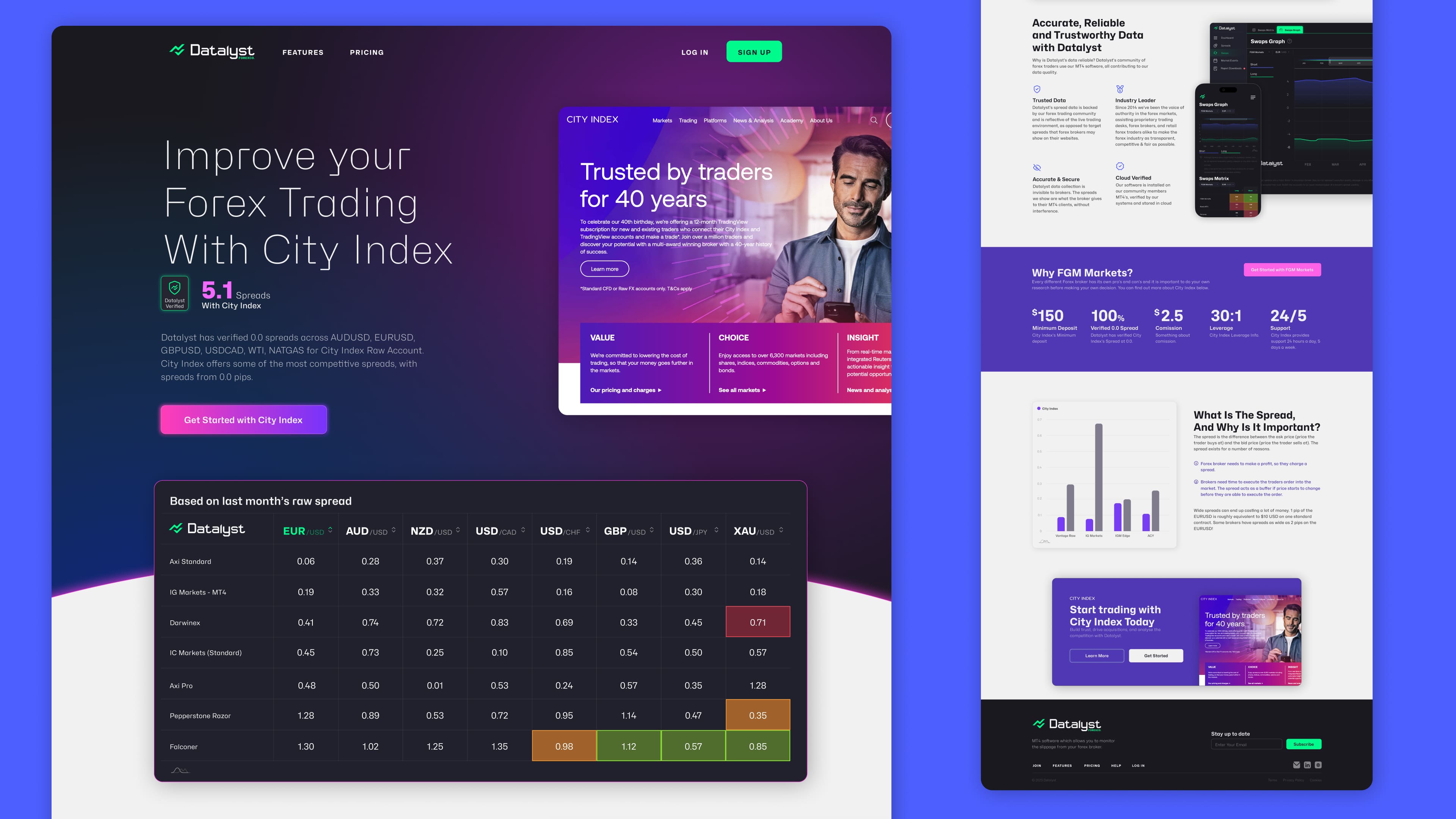 The Datalyst platform is a data-driven financial comparison tool designed to present complex trading information with clarity and confidence. Its design system focuses on clean layouts, consistent components, and clear data visualisation to make commissions, spreads, and market insights easy to understand and act on. The result is an interface that prioritises usability and trust while supporting fast, informed decision-making.