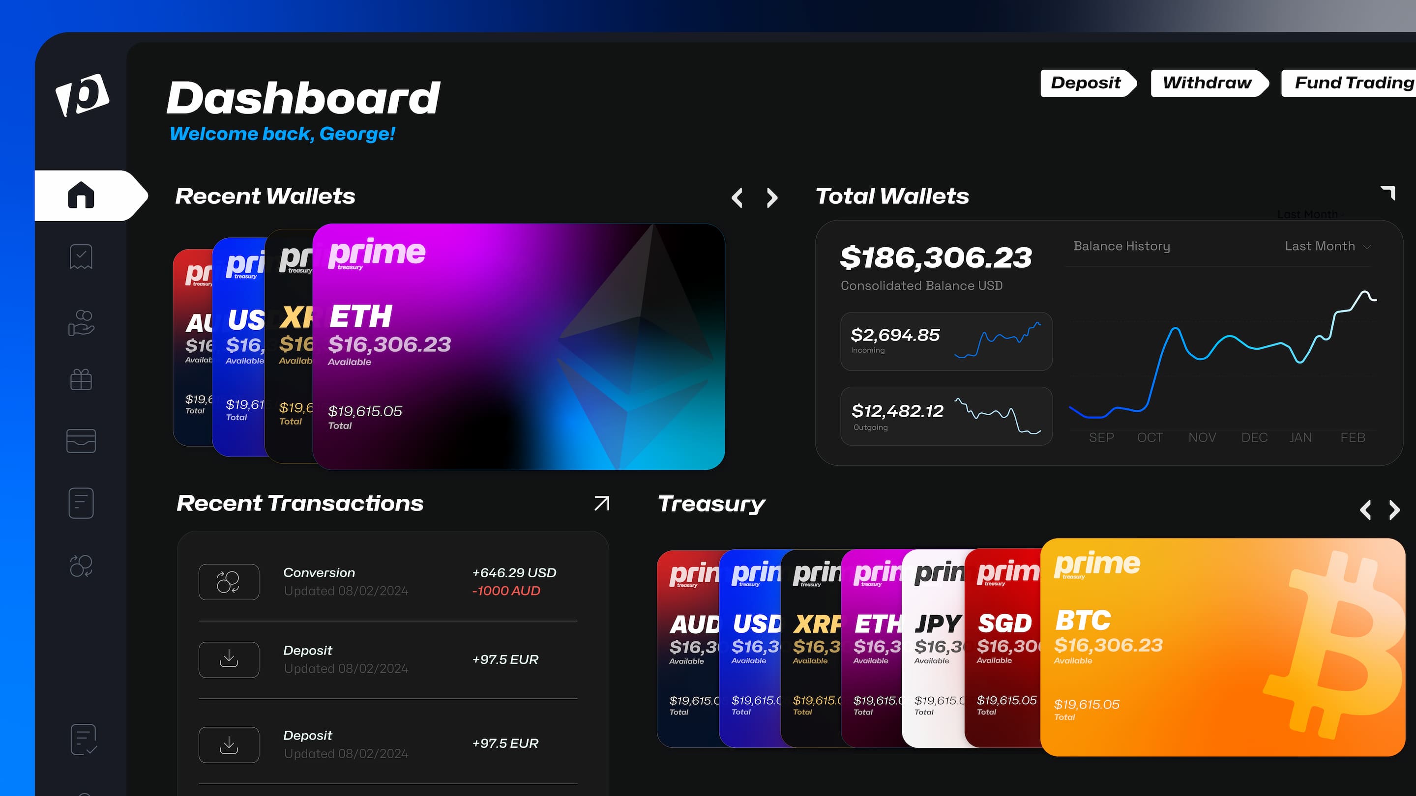 Prime Treasury presents a B2B financial platform focused on streamlined, secure payment and treasury solutions for businesses. Its design highlights intuitive finance management features like multi-currency wallets, integrated payments, and crypto/fiat conversions, all accessible through a clear, client-focused interface that emphasises control, security, and operational efficiency.